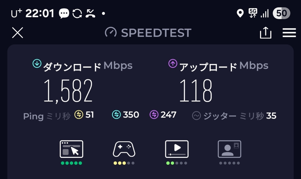 2025年5月~6月の間に、LG U+の旅行者向けSIMカードで5Gオプションが選べるようになったようです。とはいえデータ容量は実質3GB/日(毎日リセット)とかなり小さいため、スピードテストでも走らせようものならすぐに5Mbpsの速度制限にかかってしまいます。上りが5Mbpsになっているのは、恐らく下り測定中にこの速度制限に引っ掛かったのだと思います。