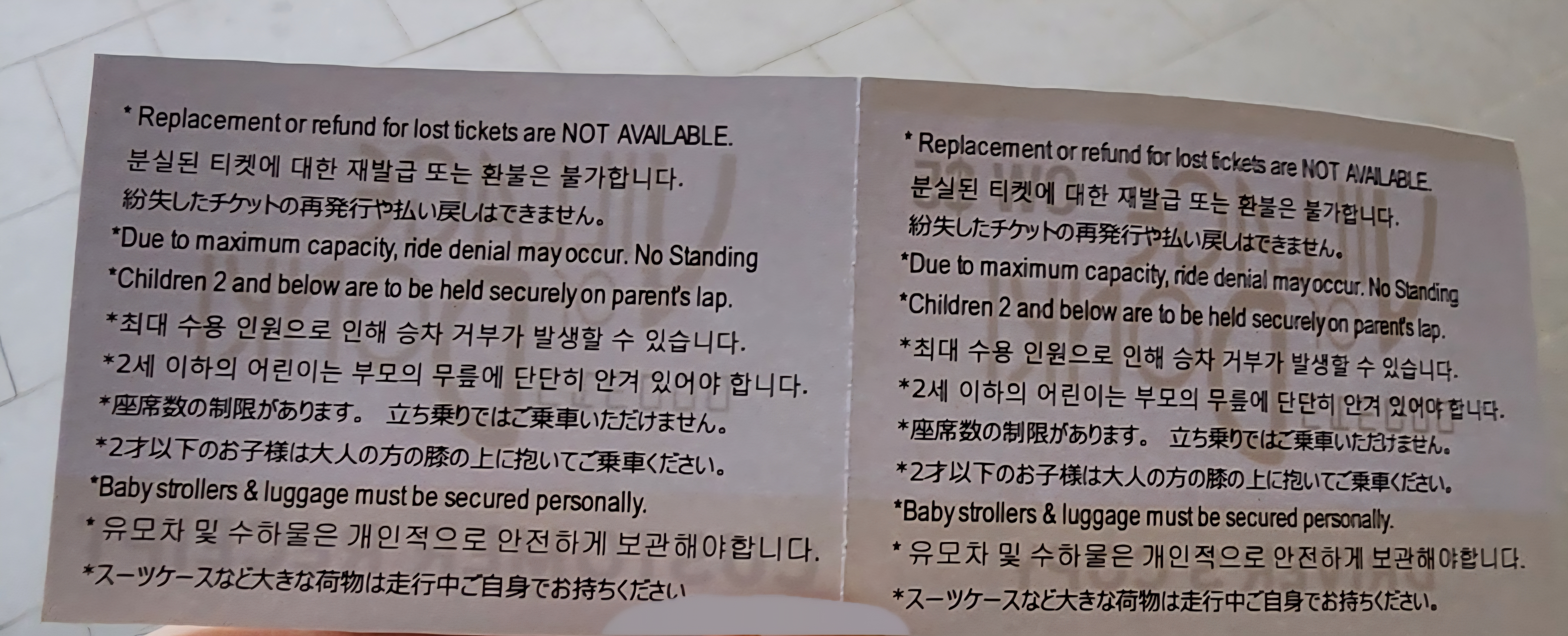 カード払い希望と伝えると、店員さんがインフォメーションカウンター前のレジで手続きをされていました。チラッとSANKOと書かれているのが見えたので、私がグアム到着時に利用した空港送迎サービスと同じ業者さんが提供されているようです。カードで5ドルを支払ったあと、レシート↑とチケットのようなもの↓を受けとりました。